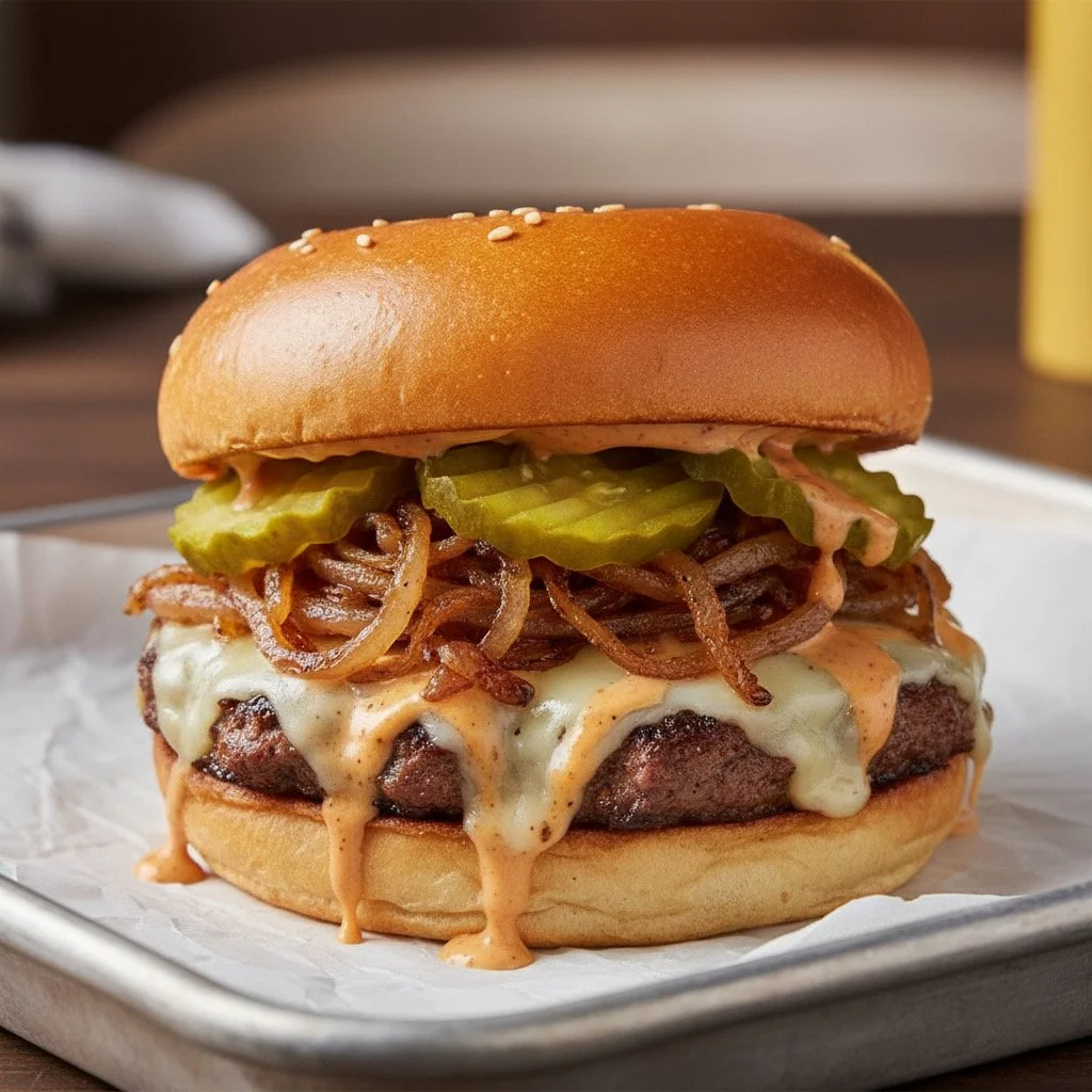 Regular or Cajun, double patty, grilled onions, cheese & burger sauce